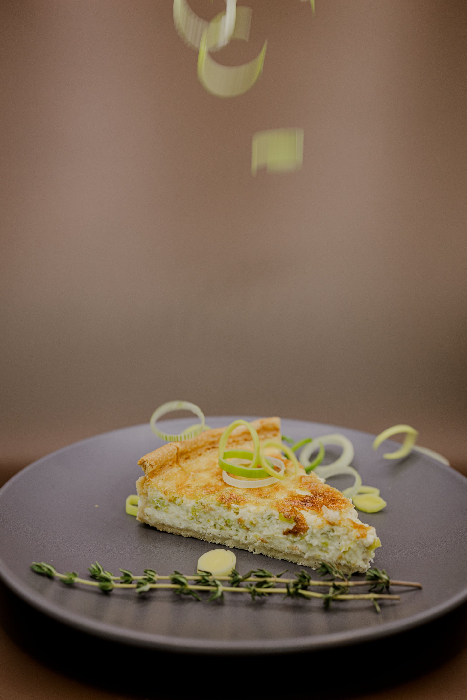 Uma mistura delicada e saborosa de alho-poró fresco, queijo Gruyère e um cremoso creme de ovos, assados com perfeição para um prato leve, porém saboroso. Nossas quiches artesanais têm uma crosta amanteigada e folhada e um recheio rico e cremoso, tornando-as a escolha perfeita para café da manhã, brunch ou refeições leves. (Vegetariano)